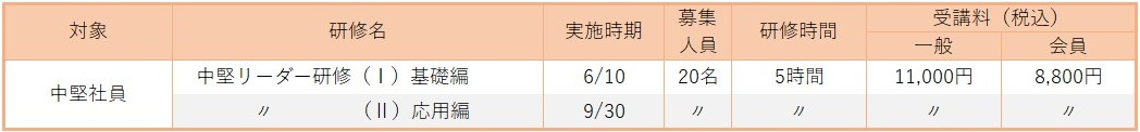 お申込みはこちら>> 中堅リーダー研修(Ⅰ) 基礎編 [6/10] | 中堅リーダー研修(Ⅱ) 応用編 [9/30]