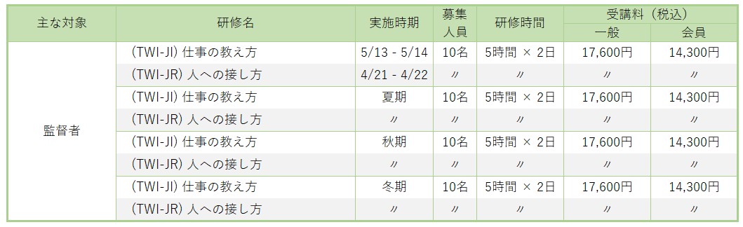 お申込みはこちら>> (TWI-JI)仕事の教え方 [5/13-5/14] | (TWI-JR)への接し方 [4/21-4/22]