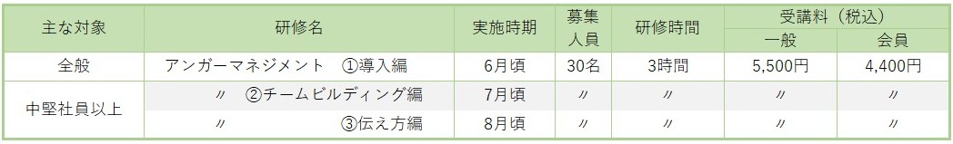 お申込みはこちら>> アンガーマネジメント 導入編 [6月頃] | チームビルディング編 [7月頃] | 伝え方編 [8月頃]